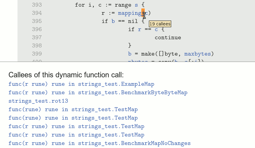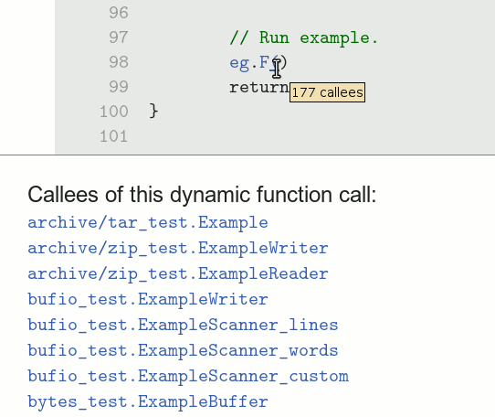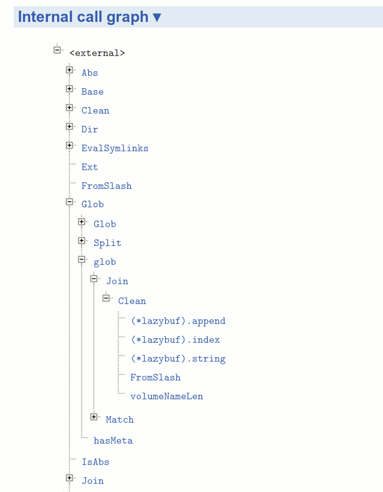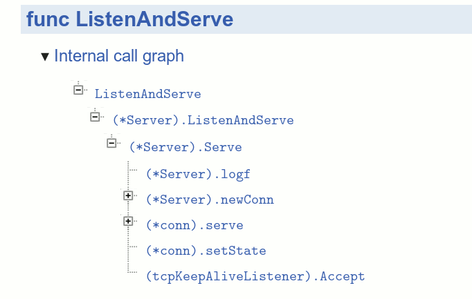 The same call graph information is presented in a very different way in the package view. For each package, an interactive tree view allows exploration of the call graph as it relates to just that package; all functions from other packages are elided. The roots of the tree are the external entry points of the package: not only its exported functions, but also any unexported or anonymous functions that are called (dynamically) from outside the package.