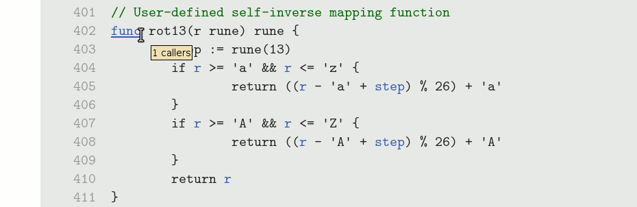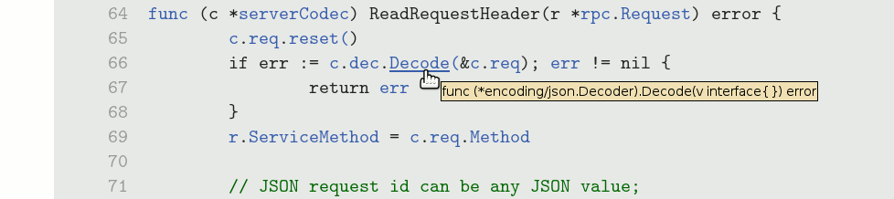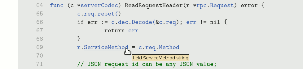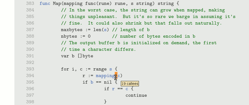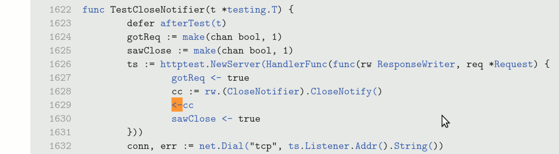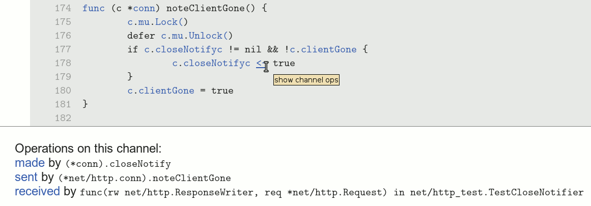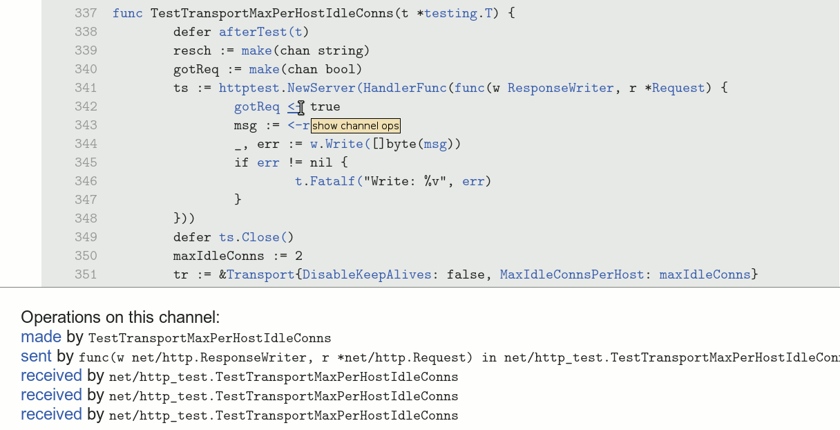 Because concurrent Go programs use channels to pass not just values but also control between different goroutines, it is natural when reading Go code to want to navigate from a channel send to the corresponding receive so as to understand the sequence of events.